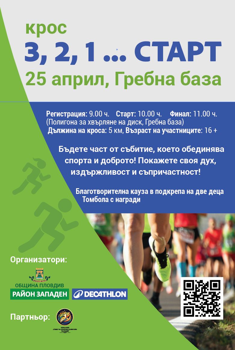 „3, 2, 1 … Старт“ е масов крос, който ще се проведе на 25 април (събота) на Гребна база Пловдив. Събитието стартира в 10.00 часа. Състезателите трябва да са над 16 години.