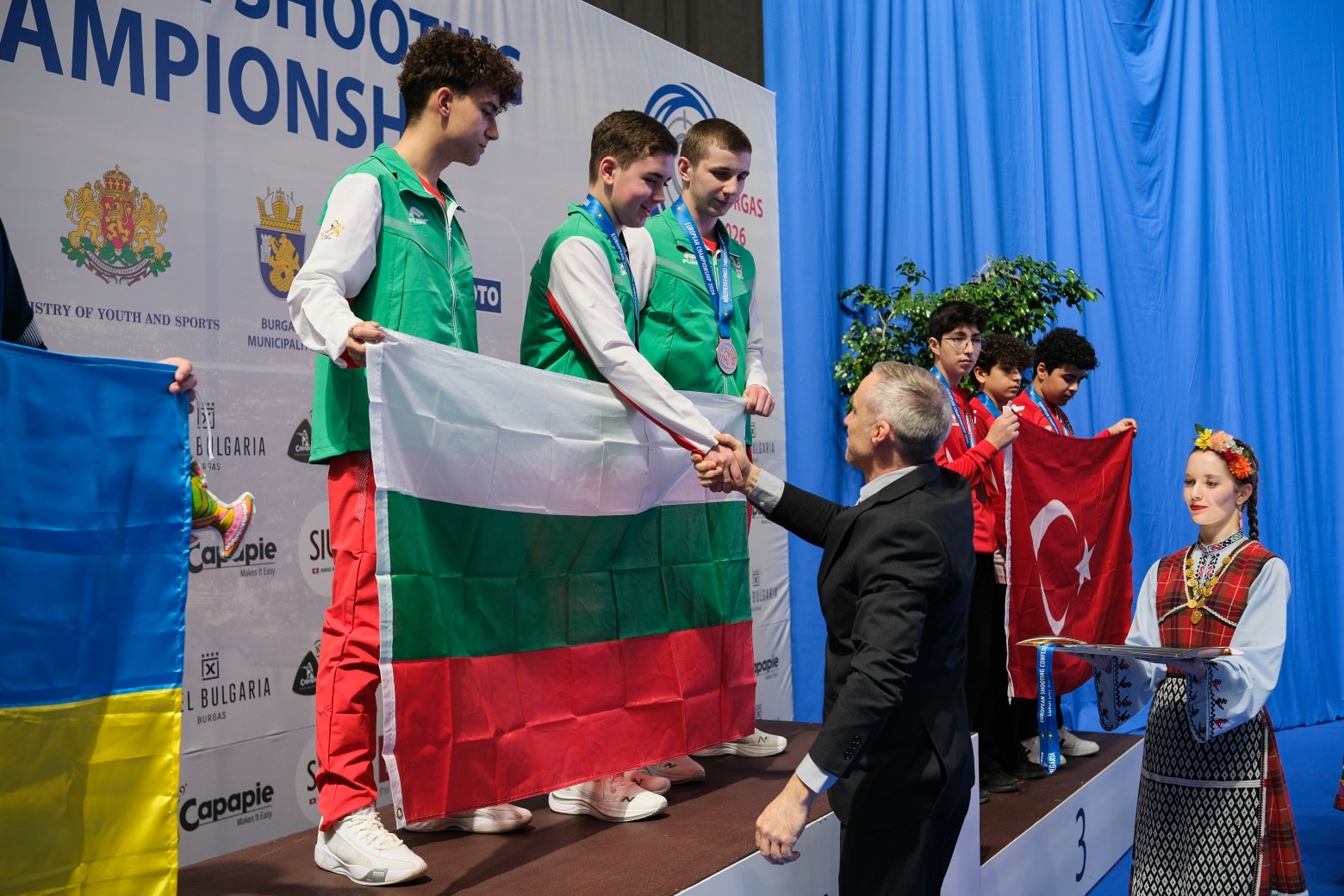България дублира европейската титла по спортна стрелба до 16 години на пистолет отборно в тази възрастова група след Талин (Естония) миналата година. За нея на континенталния шампионат по спортна стрелба с въздушно оръжие за младежи, юноши и девойки в Бургас се пребориха Борис Димитров, Даниел Делчевски и Калоян Петков.